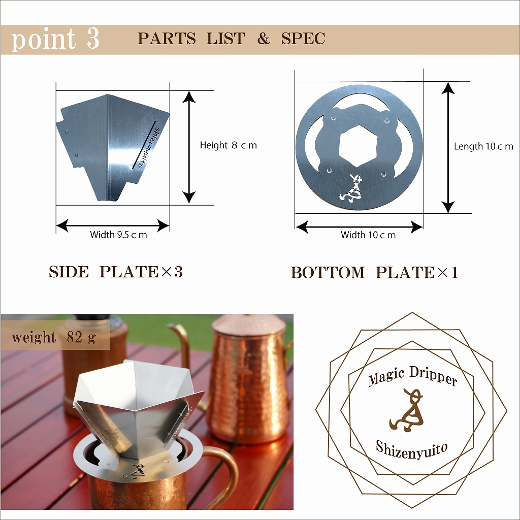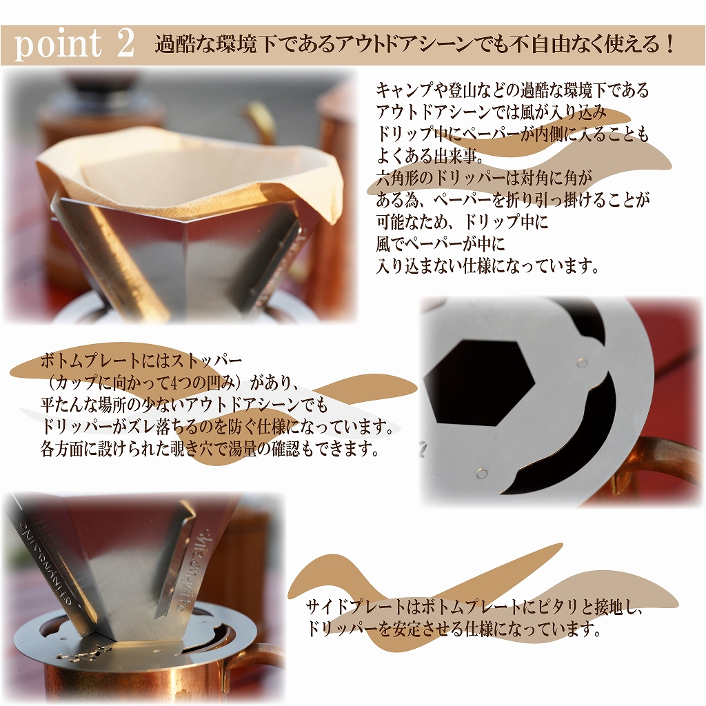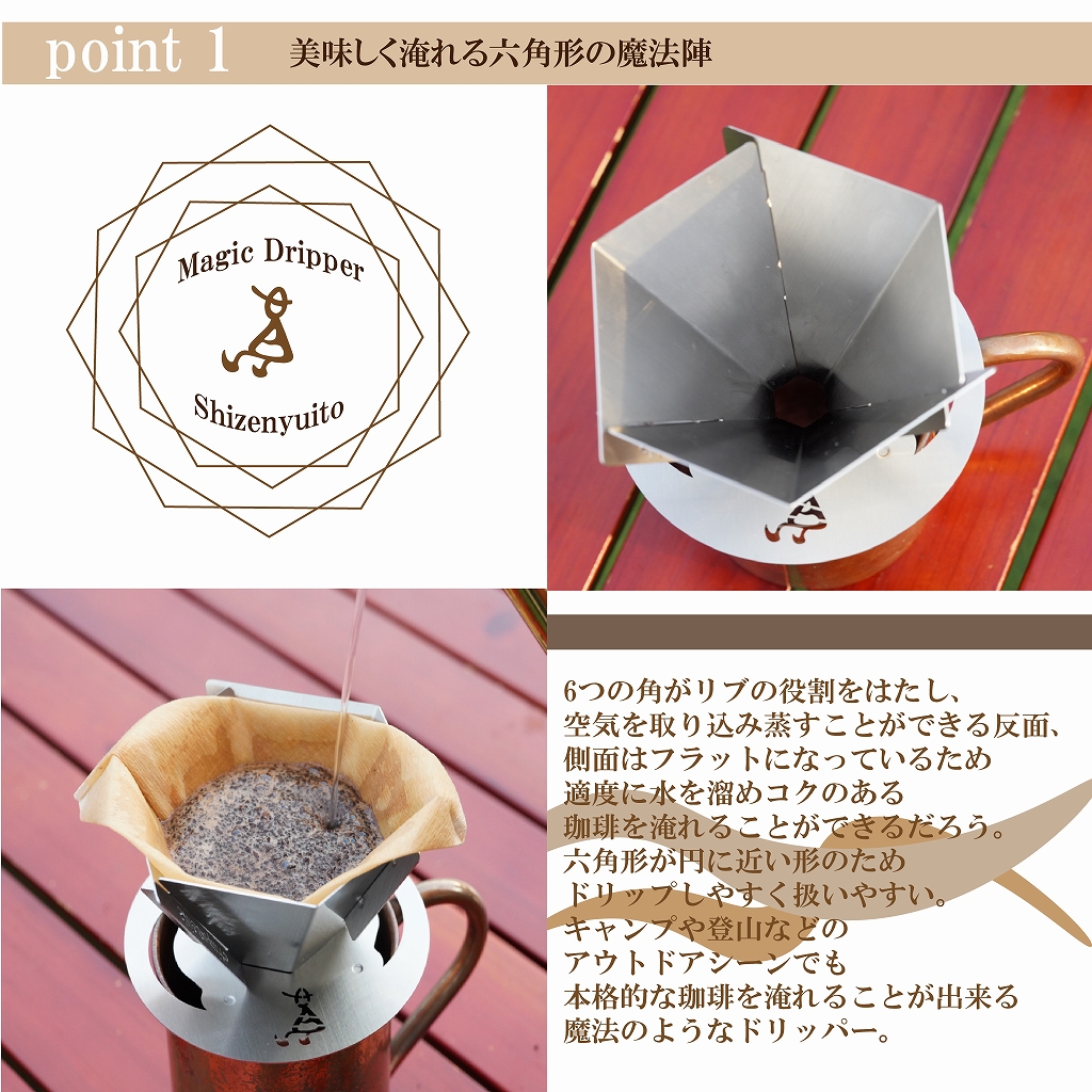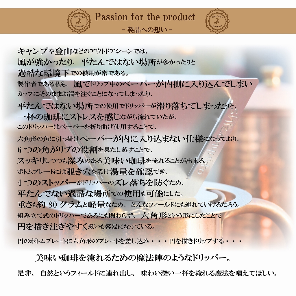オンラインショップ オンラインショップ トップページ > 自社開発製品 自然結人 > オンラインショップ Menu 0 合計 ¥ 0 現在カート内に商品はございません。 新規会員登録 ログイン 全ての商品 キャンプギア 焚き火台 鉄板 雑貨 新入荷 全ての商品 キャンプギア 焚き火台 鉄板 雑貨 新入荷 Coffee Dripper コーヒードリッパー ¥ 3,300 税込 商品コード: 関連カテゴリ 雑貨 数量 カートに入れる 商品についてのお問い合わせ 6つの角がリブの役割をはたし、空気を取り込み蒸すことができる反面、適度に水を溜めコクのある珈琲を淹れることができるだろう。六角形が円に近い形のため、ドリップしやすく扱いやすい。キャンプや登山などのアウトドシーンでも本格的な珈琲を淹れることが出来る魔法のようなドリッパー。
